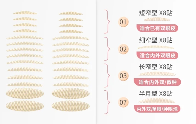 1.宽形双眼皮贴:适合眼皮脂肪较厚的内双或单眼皮,它的支撑性较强。